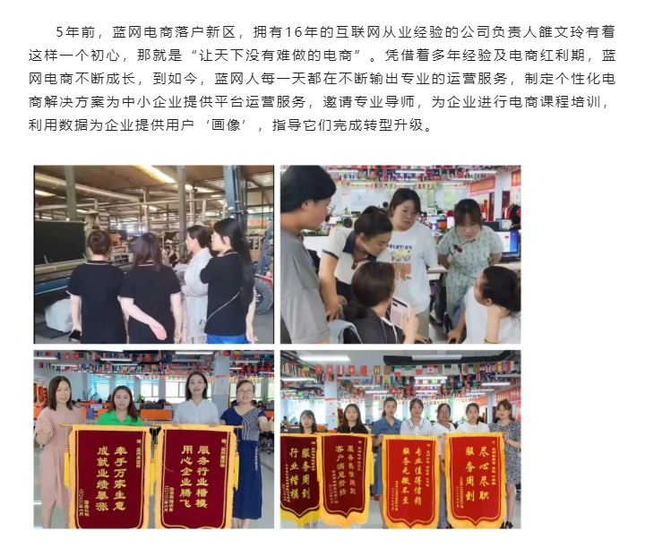 藍(lán)網(wǎng)電子商務(wù)目前在省內(nèi)多個城市開設(shè)了分公司,已服務(wù)淘寶平臺企業(yè)1575家、阿里巴巴平臺企業(yè)468家、網(wǎng)站平臺企業(yè)284家,其余拼多多、抖音、天貓、京東等平臺企業(yè)34家。