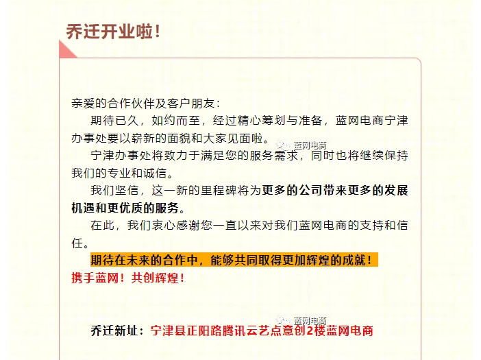 下一篇:【喬遷開業(yè)】祝賀藍(lán)網(wǎng)電商寧津辦事處盛大喬遷開業(yè)!